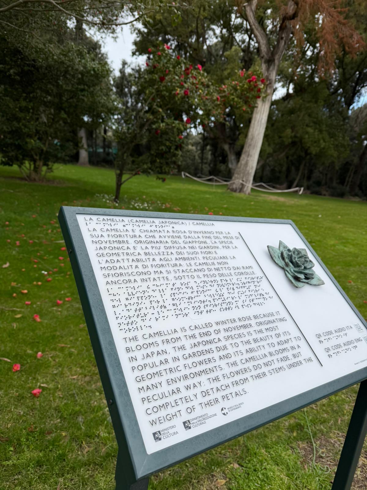 Ma l’aspetto più sorprendente è forse l’integrazione sensoriale. Le riproduzioni in bronzo di foglie e fiori, ottenute con calchi in cera dal vero, restituiscono con precisione la trama nervata di un eucalipto o la morbidezza di una camelia. Accanto, piccoli diffusori rilasciano essenze naturali che permettono di associare al nome e alla forma anche una memoria olfattiva. I QR code completano l’esperienza con video in LIS e audiodescrizioni.