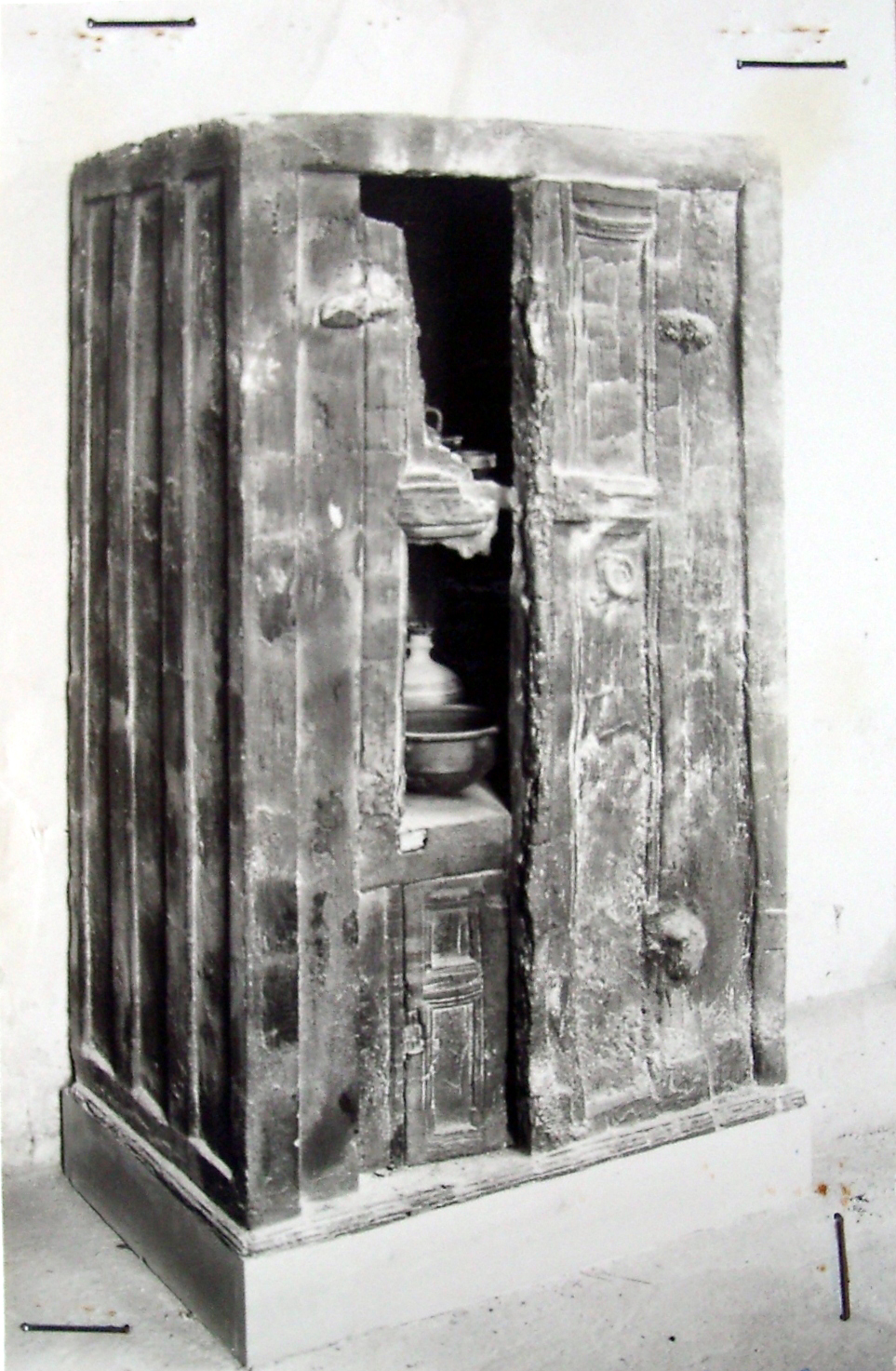 Si tratta di uno straordinario armadietto/credenza in legno carbonizzato, rinvenuto con tutto il suo contenuto durante gli scavi del 1937, accanto alla Casa del Bicentenario.