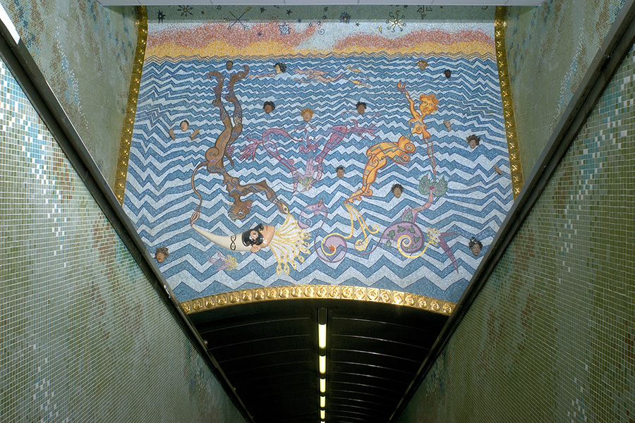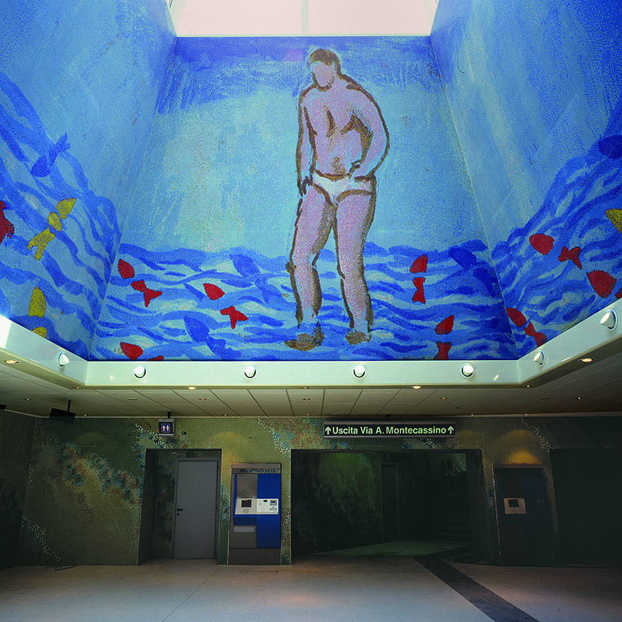 Scendendo lungo la rampa di scale che conduce ai piani inferiori, il visitatore viene avvolto dal grande mosaico con rilievi in ceramica di Luigi Ontani, che trasforma la discesa in un tuffo simbolico nel mare di Napoli: