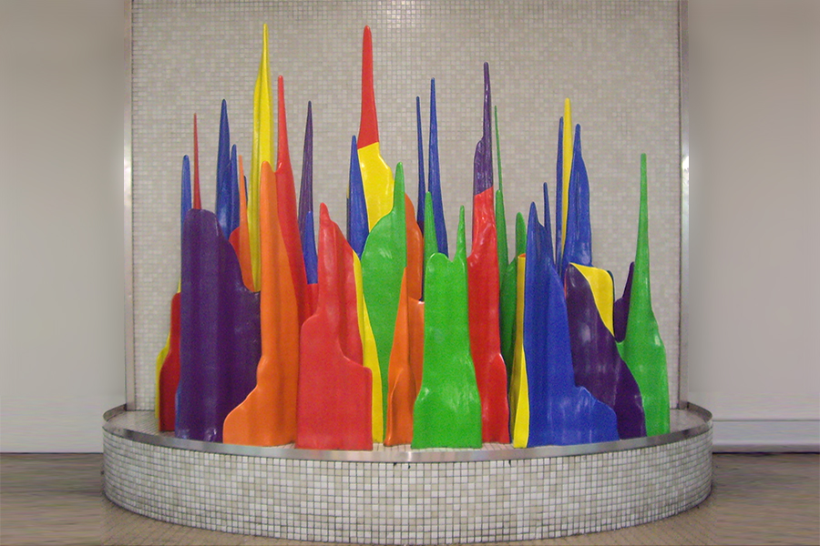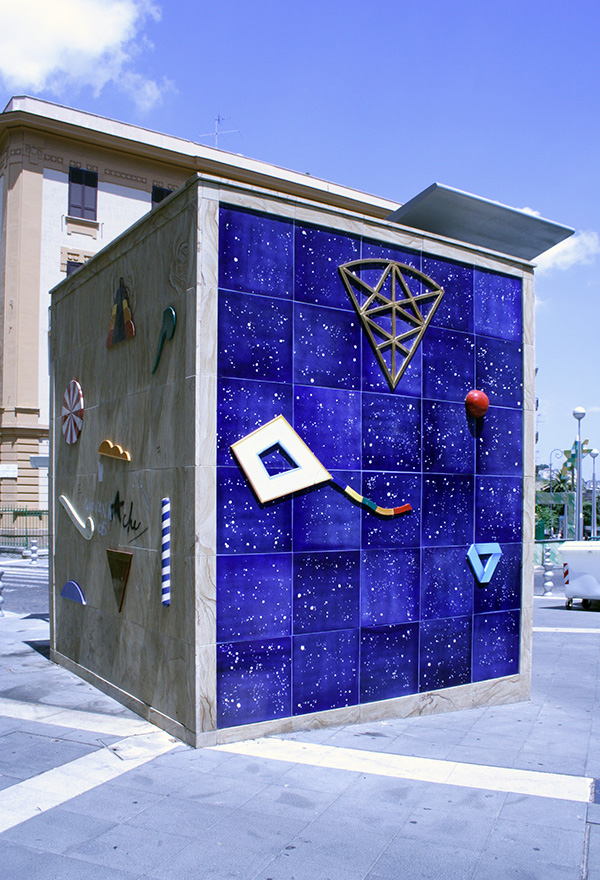 A essa si affiancano i rilievi in ceramica di Lucio Del Pezzo, che rivestono l’ascensore esterno trasformandolo in una colonna decorativa dal gusto pop.