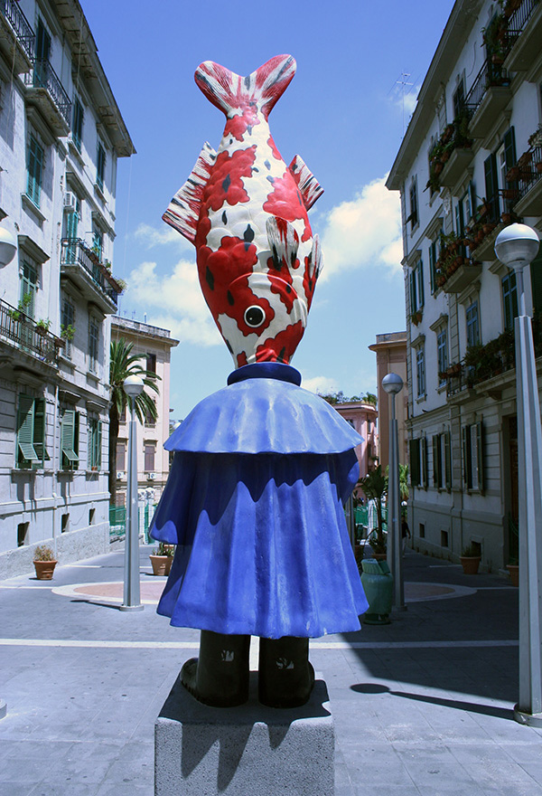 Tra le opere che accolgono i viaggiatori alla stazione Materdei spicca Carpe Diem, la scultura in bronzo colorato di Luigi Serafini, ironica e visionaria, un invito a cogliere l’attimo con leggerezza e curiosità.