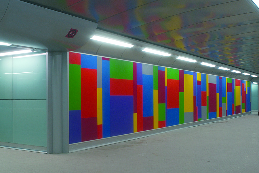 Un caleidoscopio di forme e tonalità che accompagna l’attesa dei treni come una colonna sonora visiva.