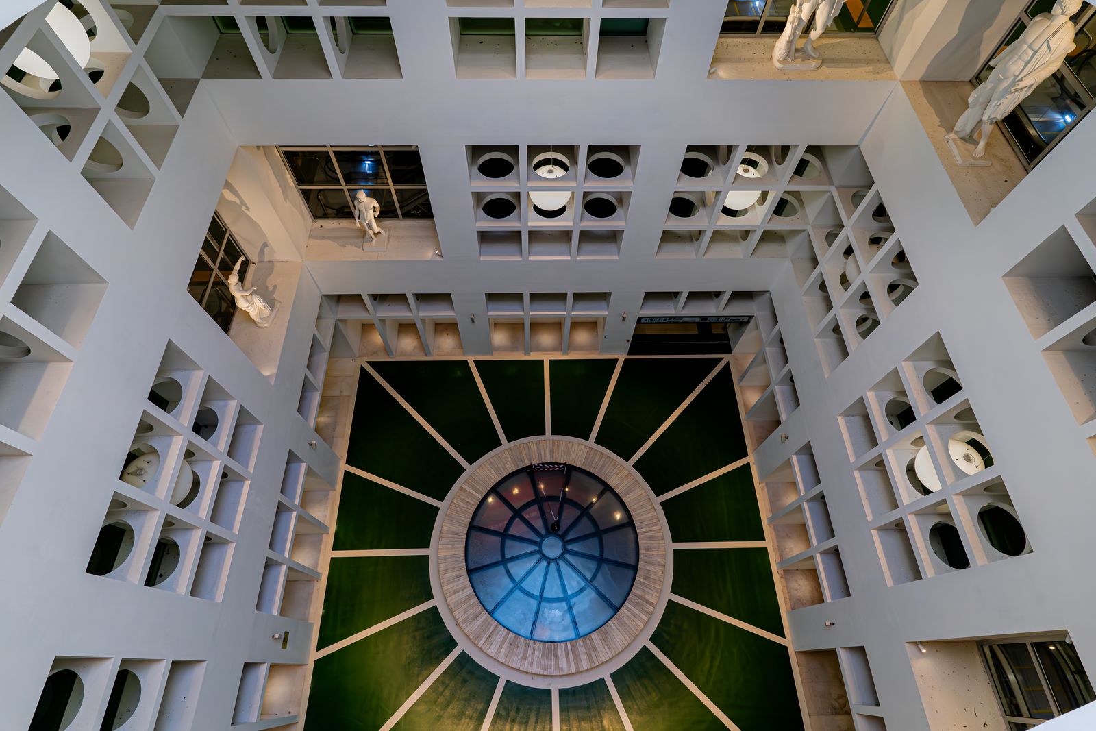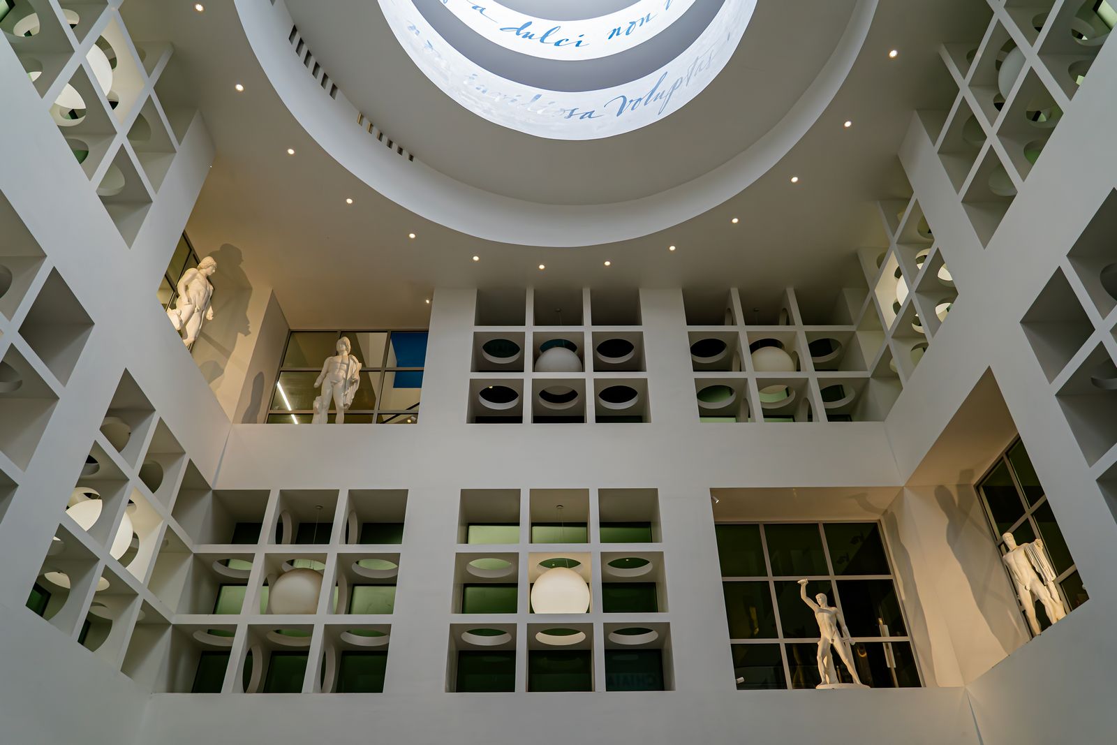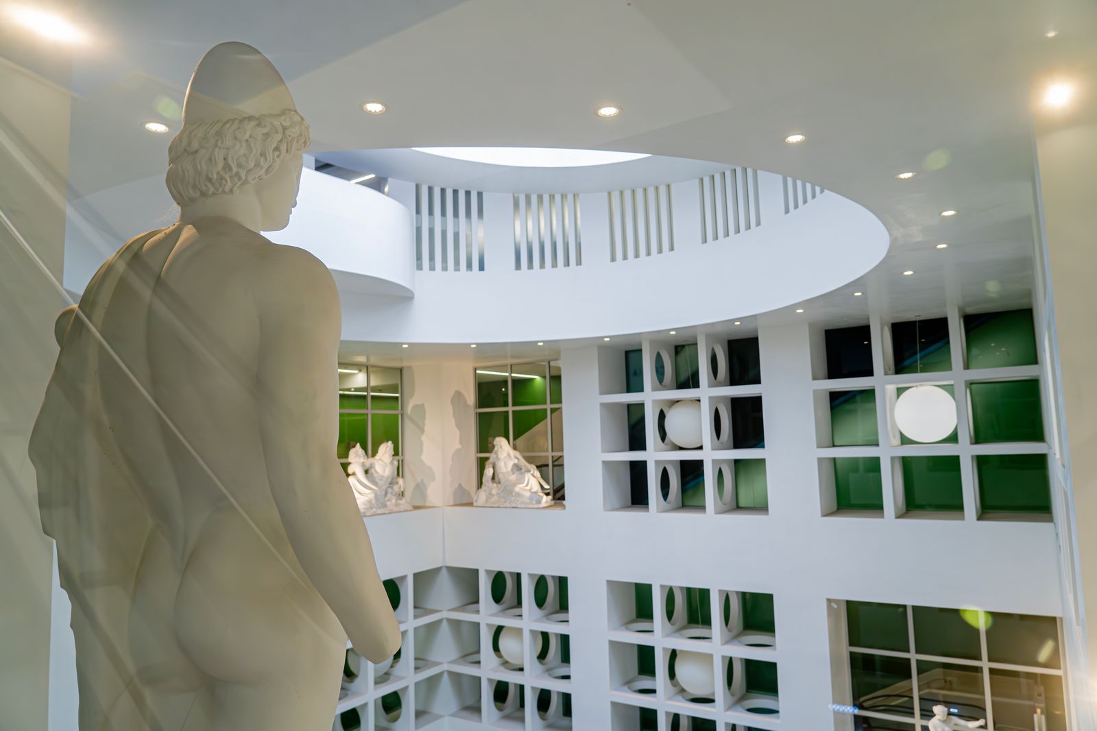 Al centro, un imponente cubo racchiude la Galleria d’Arte, dove sono esposte riproduzioni delle statue Farnese conservate al Museo Nazionale di Napoli. Questo ambiente, legato alla figura di Cerere, diventa metafora del ritorno della primavera: la natura che risorge dopo il buio e il gelo dell’inverno.