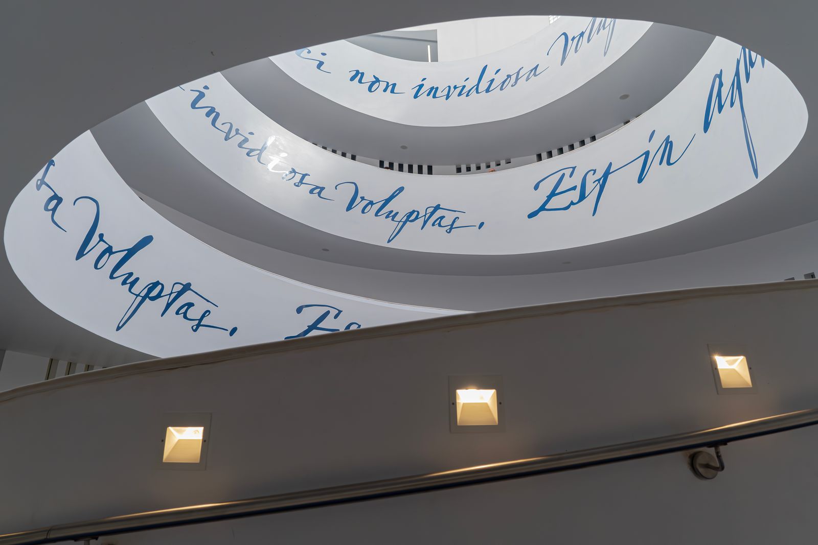 Più avanti, una rampa a spirale conduce verso un’atmosfera completamente diversa: toni bianchi e blu richiamano le profondità marine, dominio di Nettuno. L’impressione è quella di immergersi lentamente negli abissi, accompagnati da una citazione di Ovidio che celebra la serenità dell’acqua dolce: “Est in aqua dulci non invidiosa voluptas”.