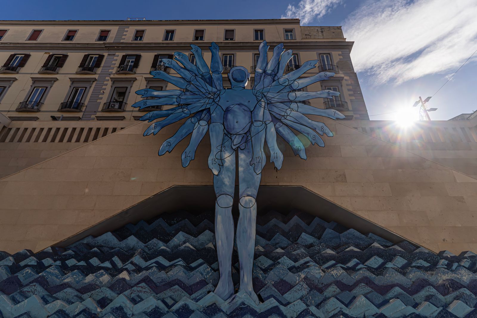 Il percorso si conclude in Piazza Santa Maria degli Angeli, dove svetta la monumentale figura di Giove. La scultura, realizzata in acciaio e dotata di ventiquattro braccia alate, rappresenta lo scorrere delle ore e il potere cosmico del dio che governa il cielo.