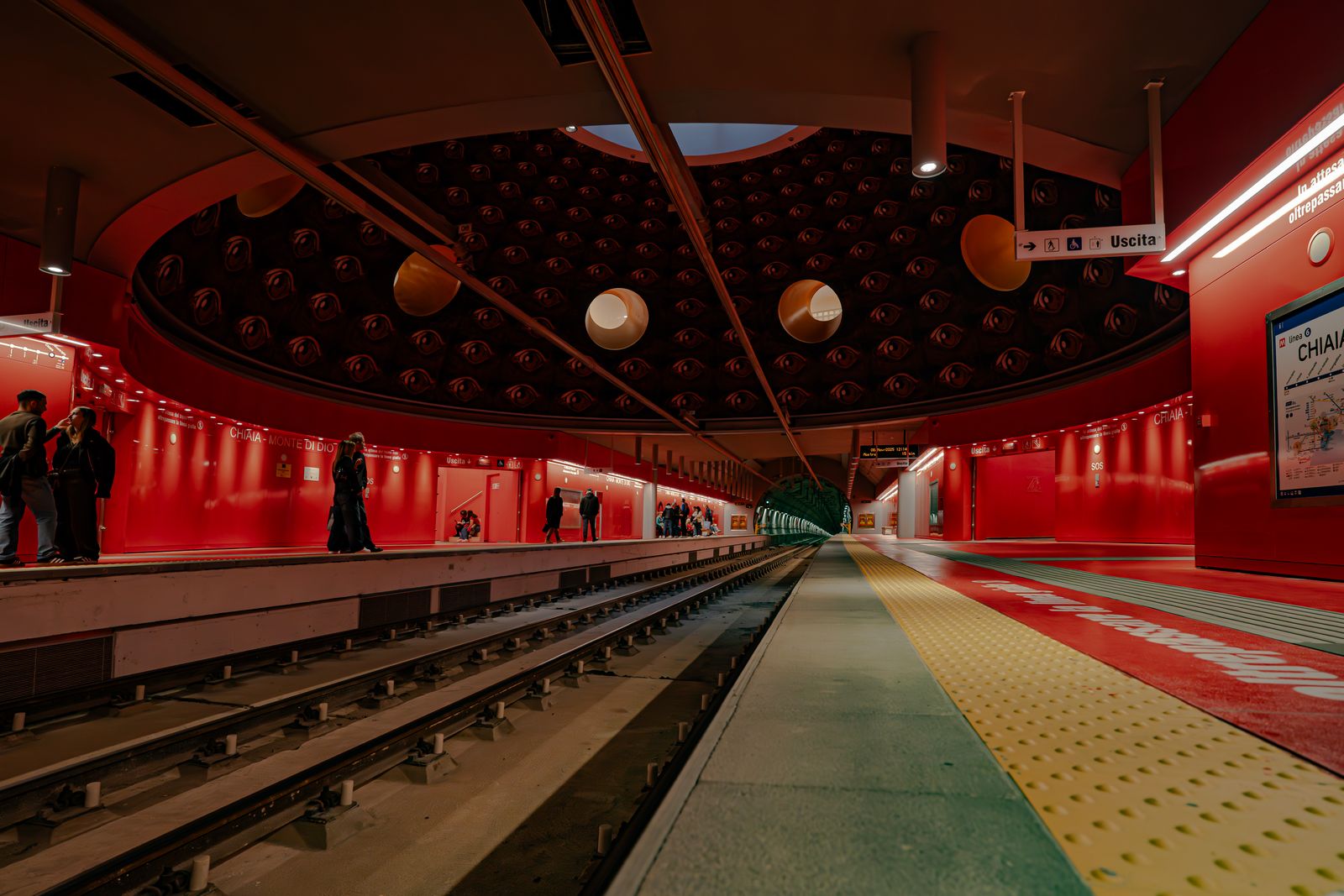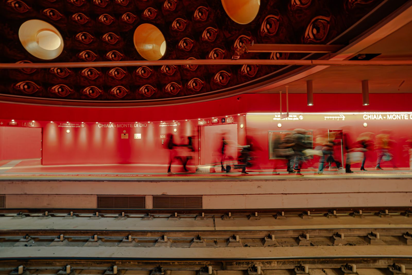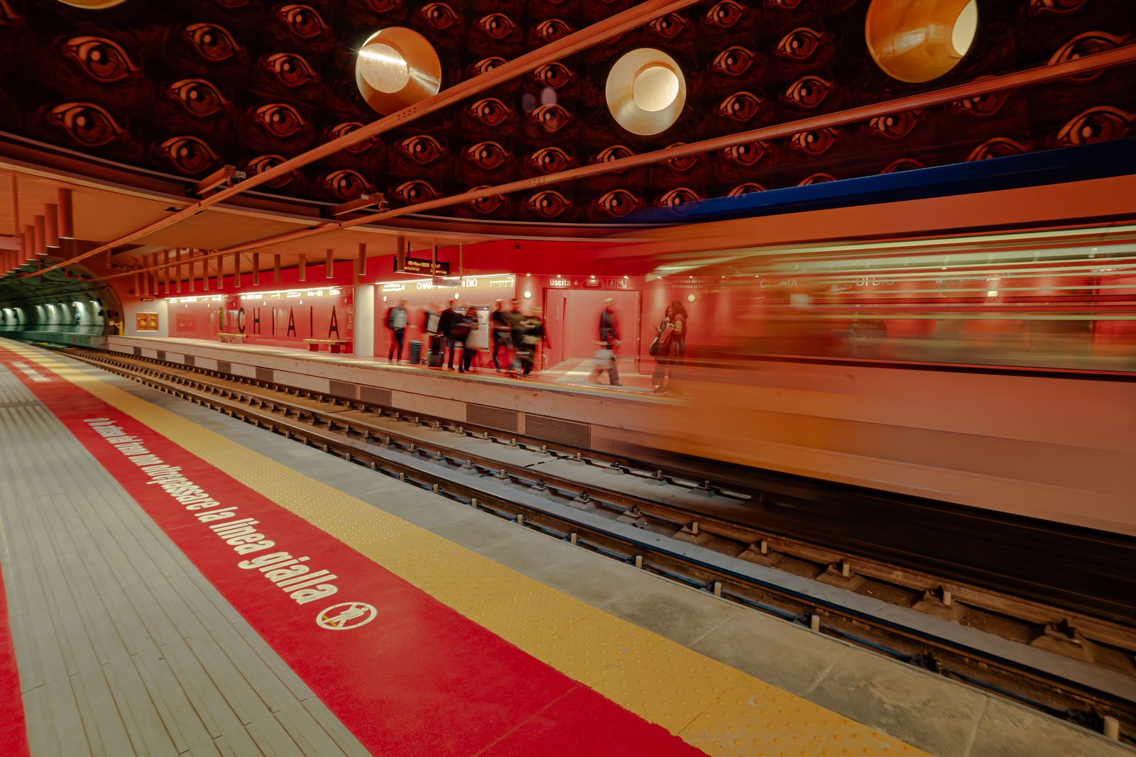 Sulle banchine, i binari dipinti di un rosso intenso richiamano l’immagine dell’Ade, il dominio oscuro di Plutone. Qui, nel cuore della terra, prende forma il regno dove dimorano le anime.