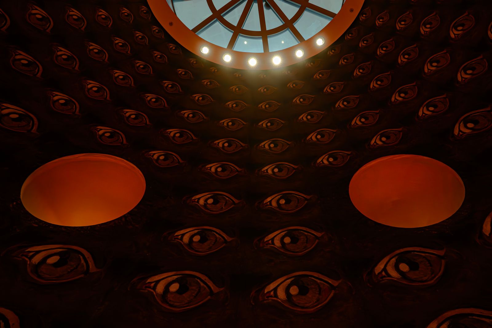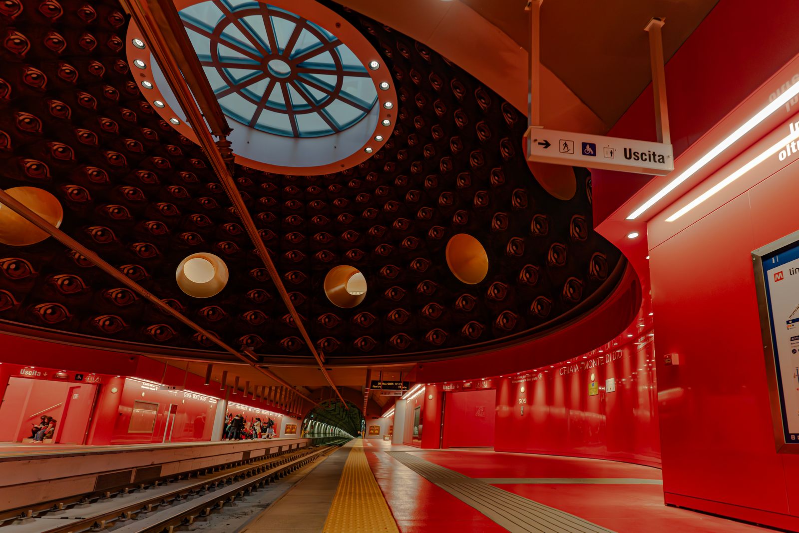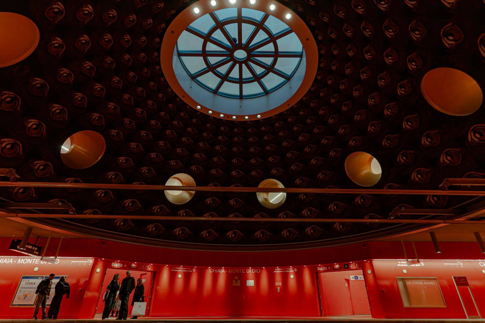 Sopra la stazione si apre una grande cupola tempestata di occhi, come se il dio degli inferi osservasse silenziosamente chi entra e chi esce dai treni. Il suo sguardo sembra congelare ogni movimento, ricordando al viaggiatore il confine sottile tra il mondo dei vivi e quello dei morti.
