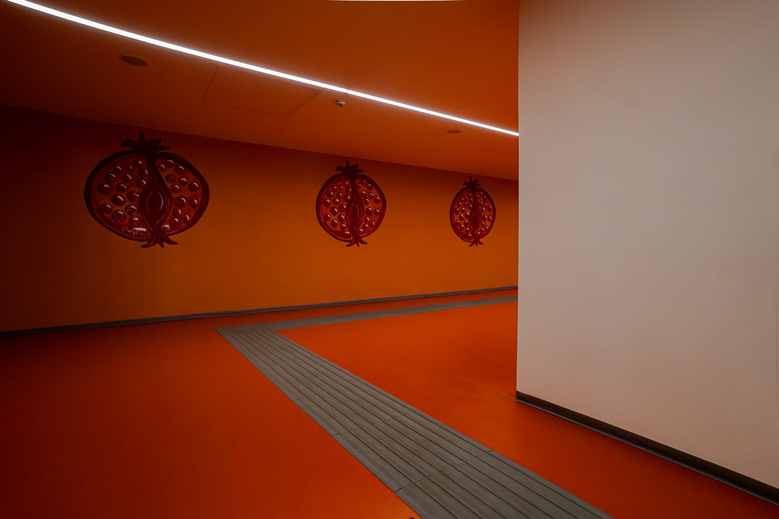 Avanzando negli ambienti interni, il rosso lascia spazio a tonalità dell’arancio. È il passaggio simbolico dedicato al mito di Proserpina: il suo rapimento, la sua discesa e il suo ritorno ciclico sulla terra, che scandisce il ritmo delle stagioni. Qui il riferimento al fiume Stige, confine tra i due mondi, è palpabile.
